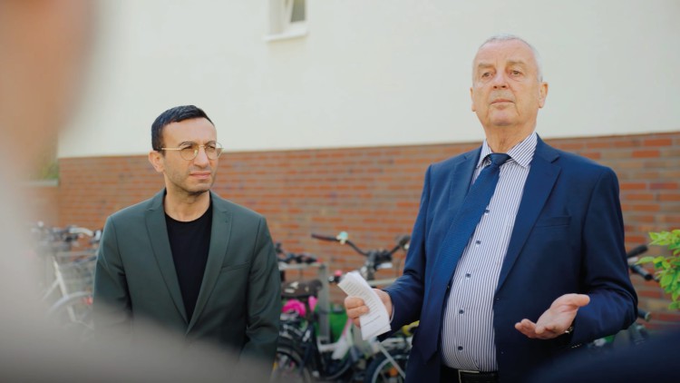 Was ist die Idee? Frank Junker (Geschäftsführer ABG), Oberbürgermeister Mike Josef und Prof. Dr. Marcus Gwechenberger (Dezernent für Planen und Wohnen) kommen bei der Besichtigung zu Wort und erläutern das Projekt.