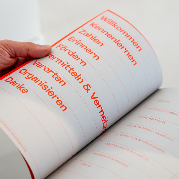 Ziel der Publikation ist es, das Interesse an der Stiftung nachhaltig zu stärken und ihren Bekanntheitsgrad sowie den ihrer Angebote zu vergrößern. Die Aufgabe bestand darin, die Stiftungsarbeit des Jahres mit einem gut durchdachten Gestaltungsraster, ansprechenden Texten und Visualisierungsstrategien lebendig darzustellen.
