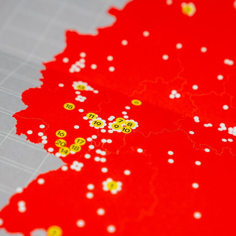 Grundlegendes Gestaltungselement ist der Kreis, der sich aus dem Logo der Stiftung ableitet. Er ist zentral mit dem Aspekt der Orte und Verortung verknüpft – zeitlich sowie geografisch. Als Punkt oder runde Flächen findet er sich im Raster sowie als Bestandteil der Infografiken wieder. Punkte und Kreise vermitteln Aufgeräumtheit, erlauben aber auch einen spielerischen Umgang als Marker oder Illustration.