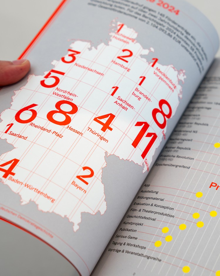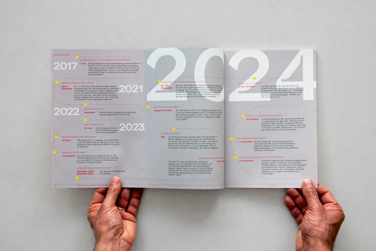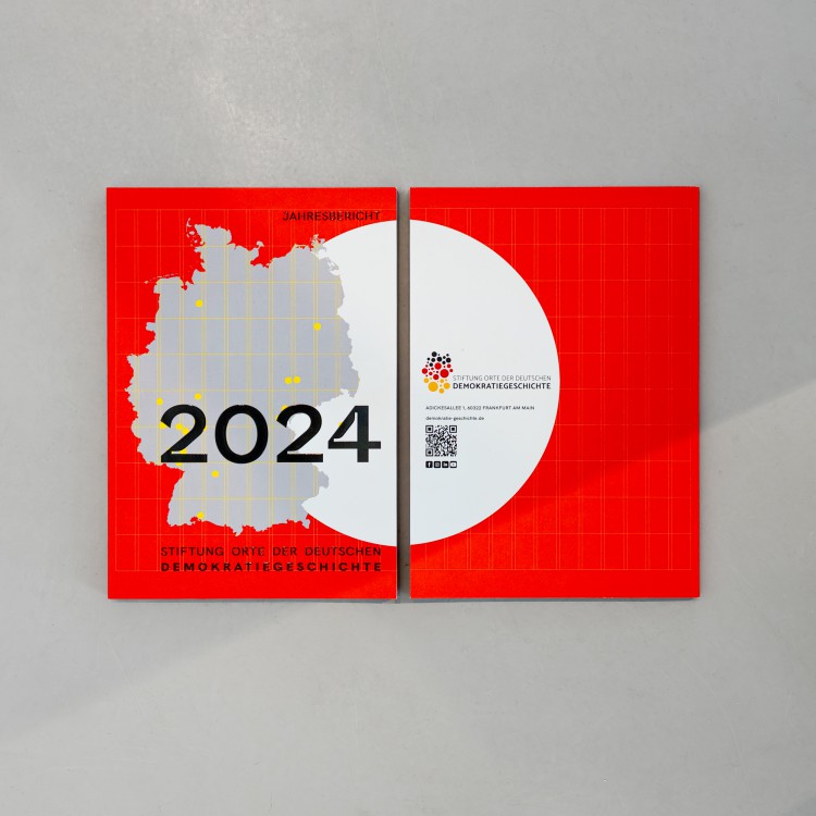 Die Stiftung Orte der deutschen Demokratiegeschichte vermittelt Demokratiegeschichte und macht ihre Orte erfahrbar, um Bewusstsein und Haltung für Demokratie zu fördern. Sie zeigt, wie essenziell demokratische Werte für Freiheit, Gerechtigkeit und ein starkes Miteinander sind. esistfreitag hat den Jahresbericht des ersten vollen operativen Jahres 2024 grafisch sowie textlich neu konzipiert und den kompletten Prozess der Gestaltung, der Redaktion, des Lektorats und der Druckbegleitung realisiert. Dieser erste Jahresbericht bildet den Grundstein für eine fortlaufende jährliche Veröffentlichung.