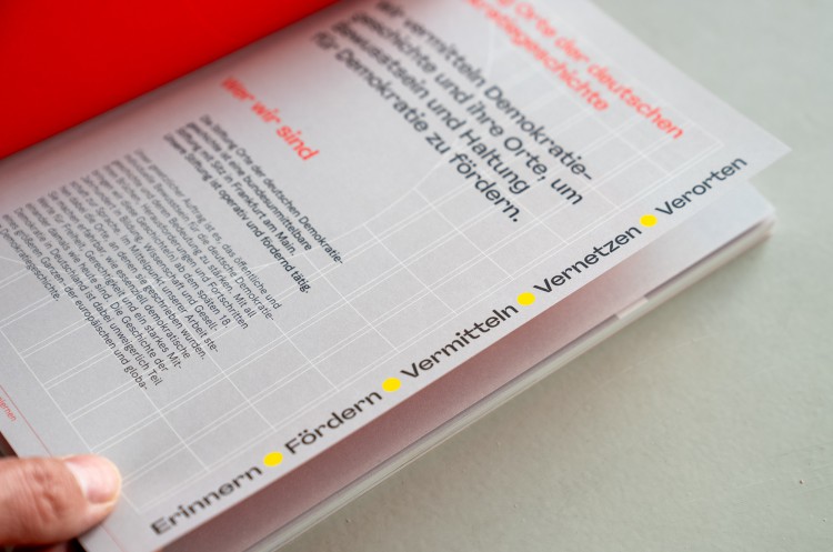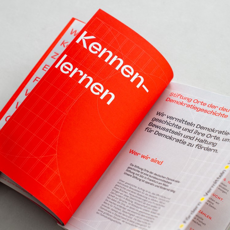 Die gestalterische Konzeption basiert auf den drei Kernelementen der Stiftung: Orte, Geschichte und Demokratiebildung. Der visuelle Fokus liegt auf der Geschichte und den Orten, die als Anker dienen. Grundlegend sind außerdem die Zukunftsorientierung und die Vielfältigkeit der Stiftung und ihrer Arbeit sowie ein inklusiver Ansatz: ein zugängliches und nicht zu wissenschaftliches Auftreten.