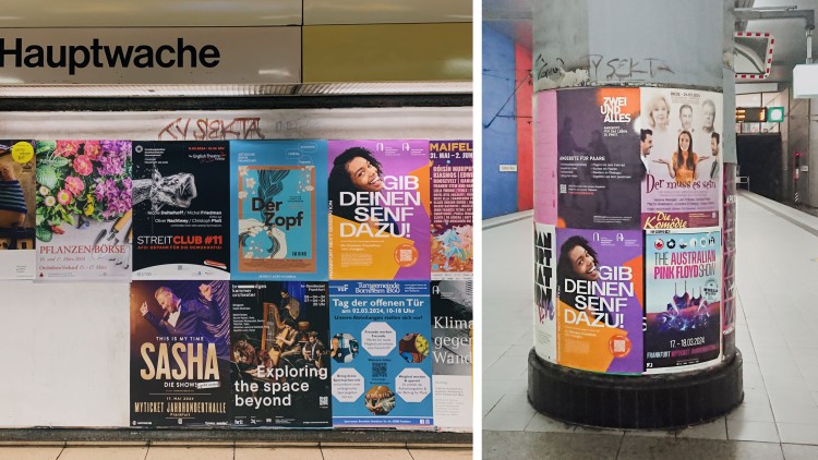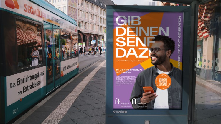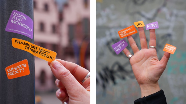 Die Landingpage dient als zentraler Anlaufpunkt für die Umfrage: Sie weckt Interesse, liefert Erklärungen und informiert umfassend. Um die Kampagne in den Alltag und in das Stadtleben zu integrieren, wird sie über die digitale Welt hinaus durch Sticker, Postkarten und Plakate im gesamten Frankfurter Stadtgebiet sichtbar gemacht.